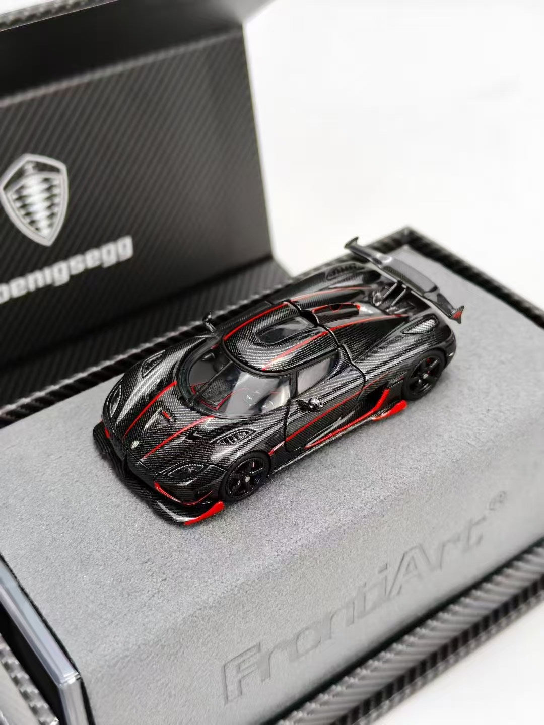 Frontiart 1/64 Koenigsegg Agera RS Genesis - Carbon Fiber with Red Accents, the first zinc alloy open-hood version with resin crafted intricate details!