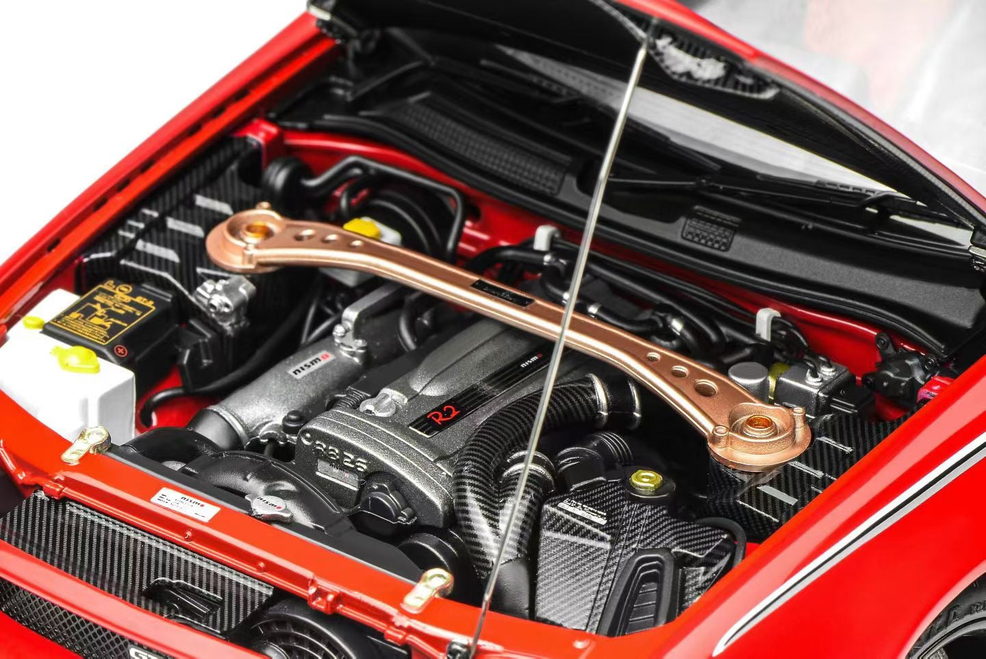 This model highly replicates the real car with a sleek, fine paint finish. The vibrant Active Red body paired with Nismo decals exudes intense sportiness. Key features: opening doors/front/rear hoods, steering wheel linked to front wheel movement, fully three-dimensional engine, and detachable front/rear underbody panels. Packaged in a high-density foam box + colorful gift box, accompanied by an exclusive door opener, certificate, and manual.