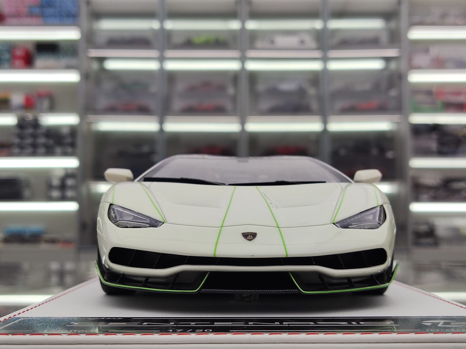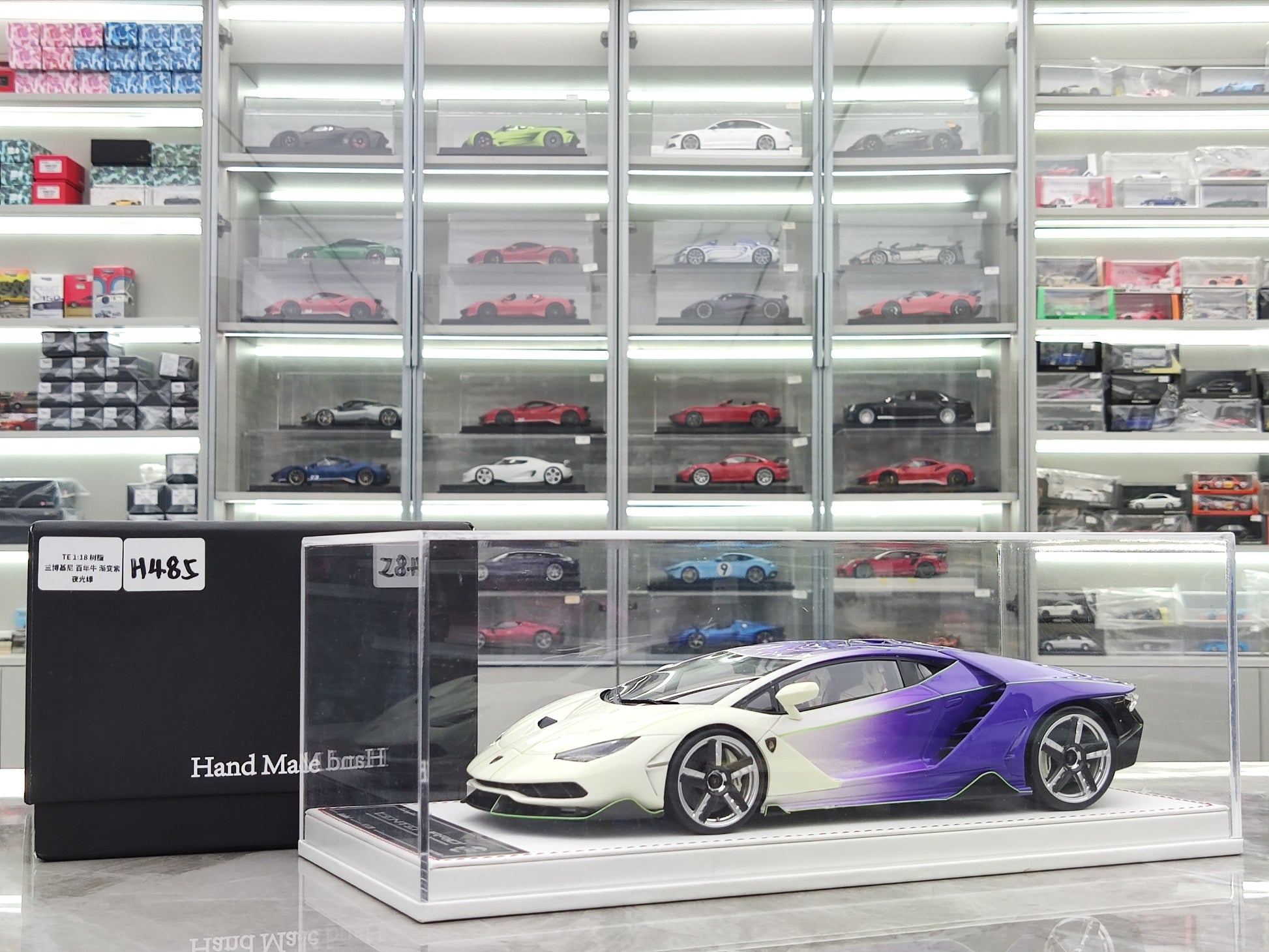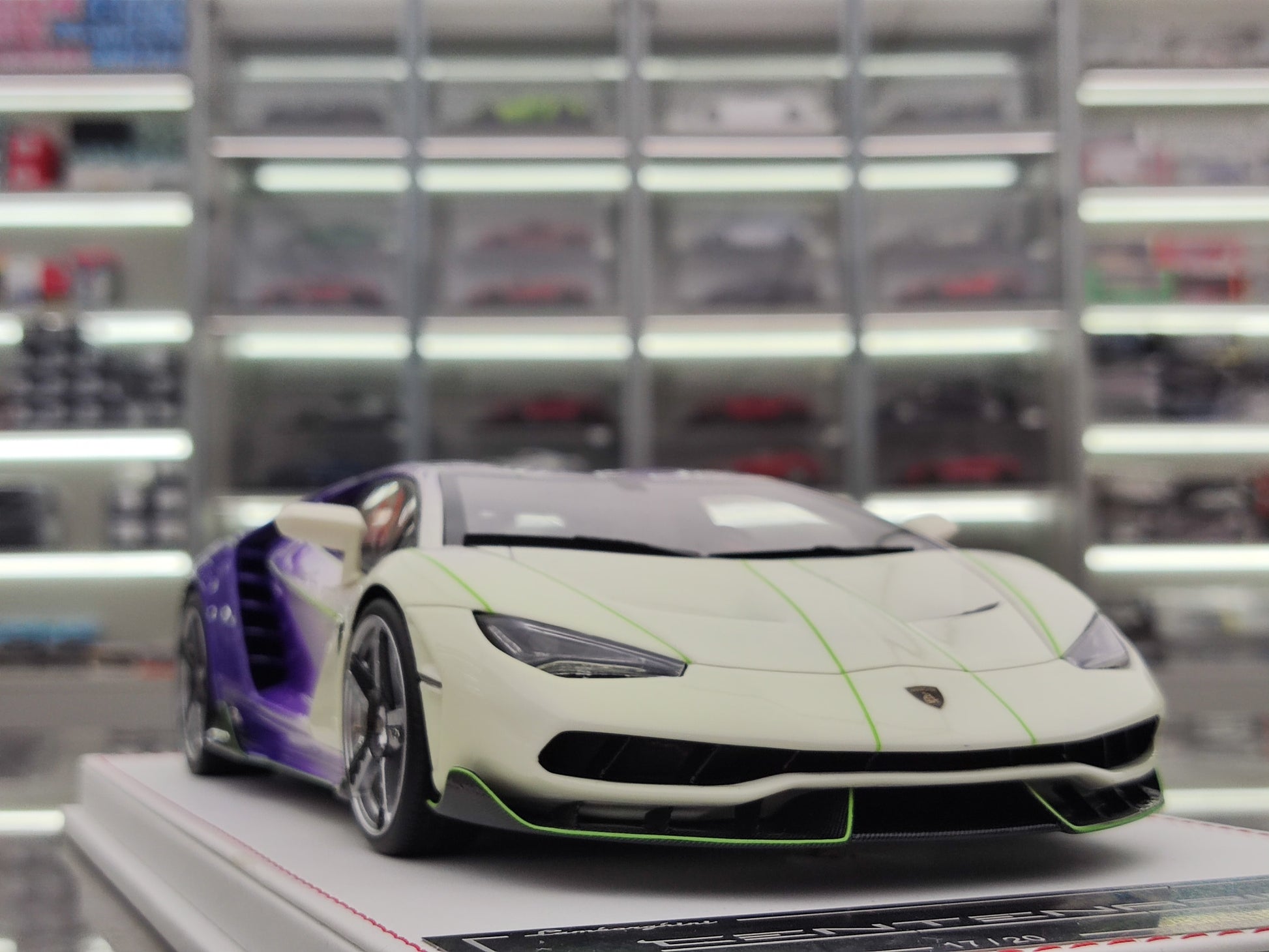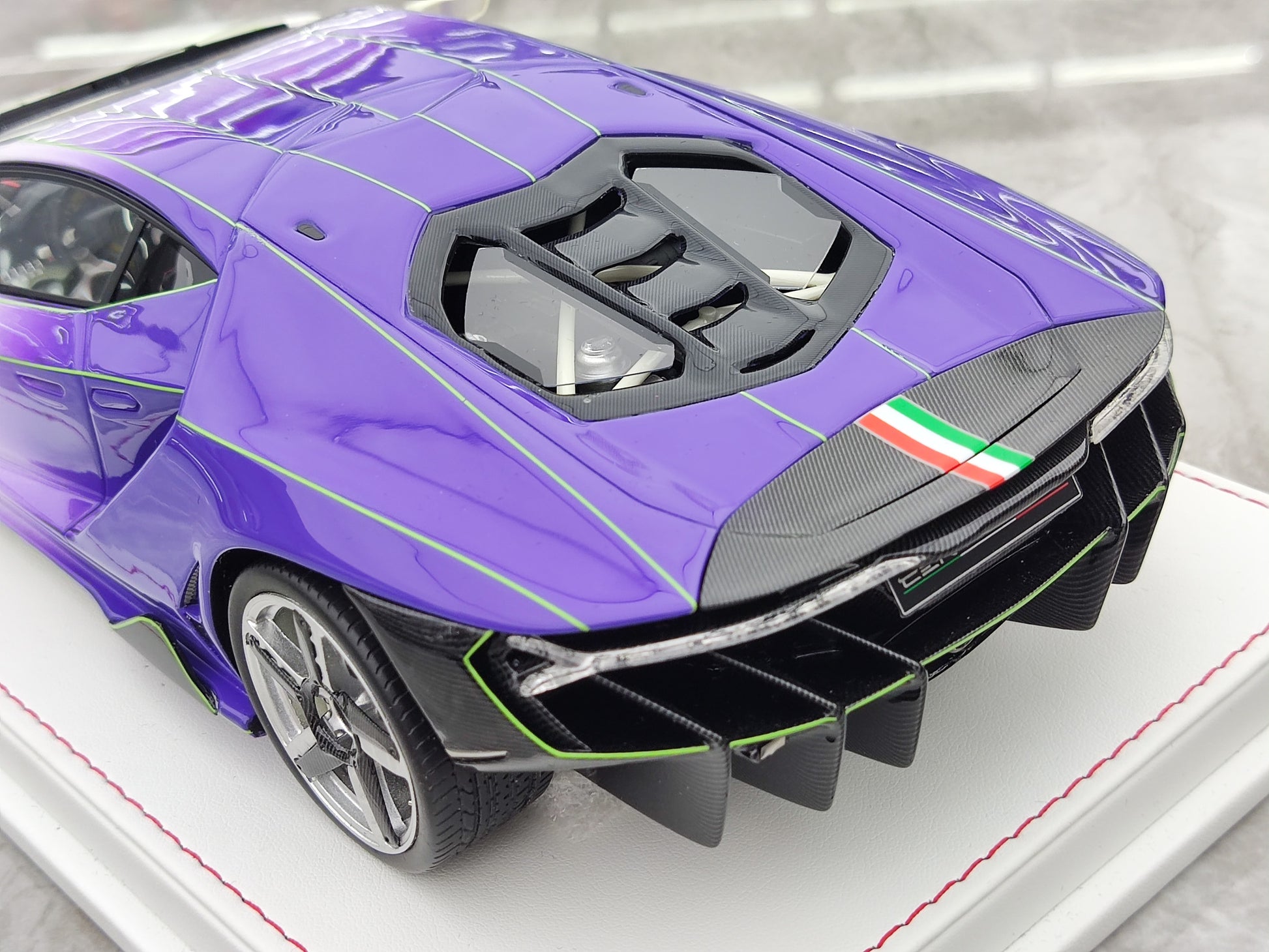 This TE 1/18 Lamborghini Centenario model car is a beautiful and detailed representation of the real thing. Made with resin, it features a unique gradient purple and glow-in-the-dark green color scheme. Perfect for display as a collectible or decorative piece, this model car is a must-have for any car enthusiast or fan of the iconic Lamborghini brand.